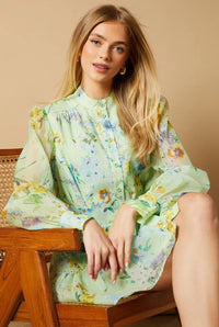 Deep forest batik with wavy stripes meets sunshine ruffle sleeves. Finished with oversized contrast pockets and a border hem. ...